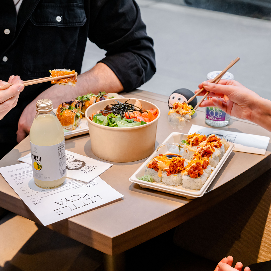 „Little Koya“ bedeutet auf Japanisch kleines Haus, oder Hütte. Unsere Speisen werden täglich frisch zubereitet und sind zum Großteil ready to eat. In der Vitrine findet ihr Sushis, wie flambierte Lachs Nigiri, Trüffel Lachs oder Thunfisch Tartar Rolls, Salate und coole Drinks.